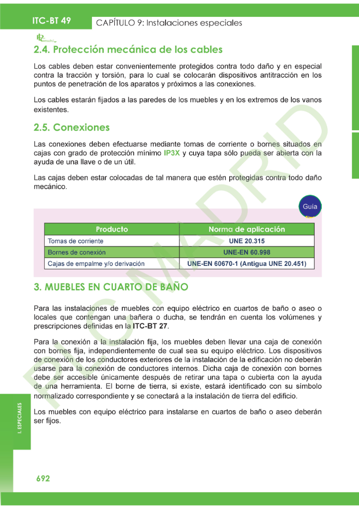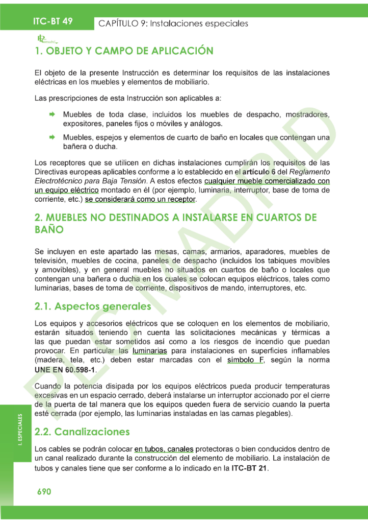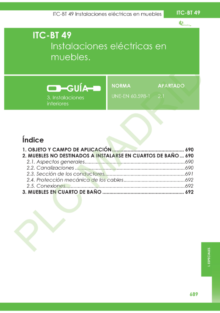La instrucción técnica 49 del Reglamento Electrotécnico de Baja Tensión, fija el objeto y campo de aplicación para instalaciones eléctricas en mobiliario, diferenciando claramente los muebles no destinados a instalarse en cuartos de baño y los muebles para baños.